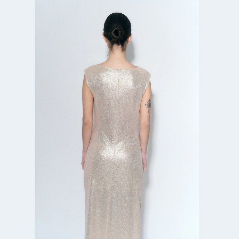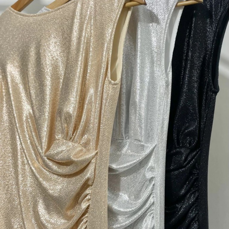 Vestido largo de lurex con frunce en el costado. Tiene lycra. Tiene forrería.