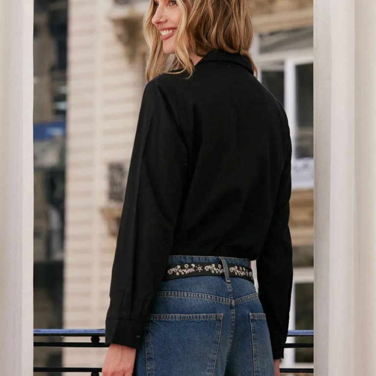Camisa confeccionada en algodón, de manga larga terminada en puño. Delicadamente bordada en la parte frontal y con acceso por medio de botones de pasta.